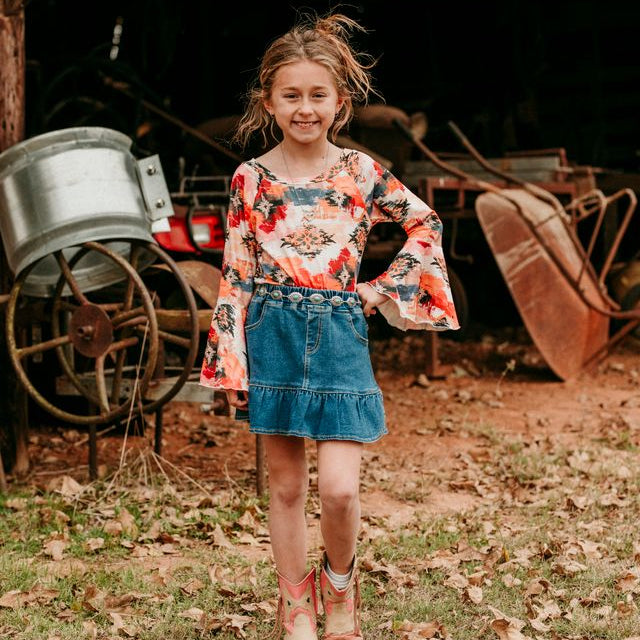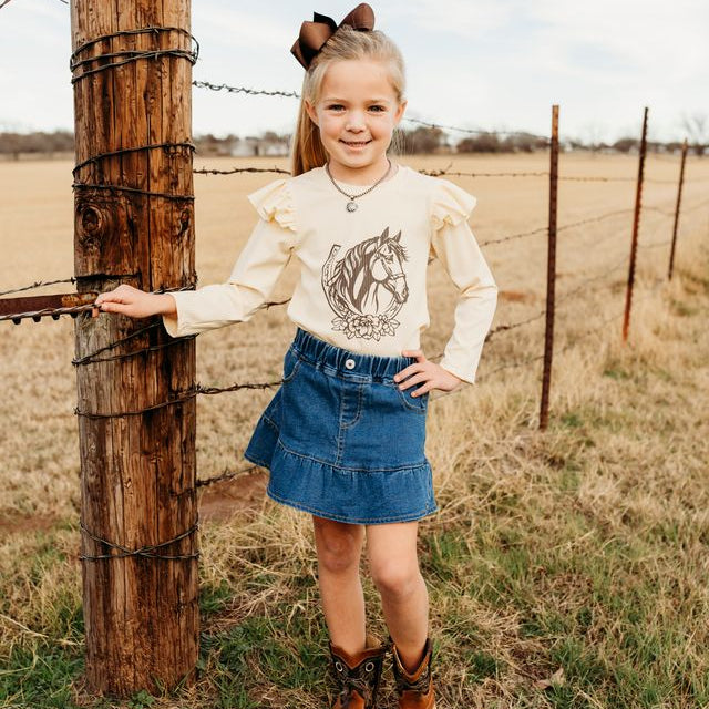 The Denim Skirt matches all of our Shea Baby tops, and Shea Baby Boots.