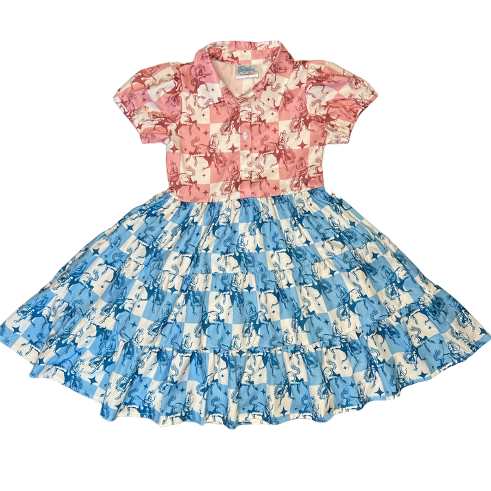 Perfect for cowgirls, this plaid bucking horse flow dress blends classic western style with playful fun! This soft, breathable fabric makes this dress a must have this Spring/ Summer!