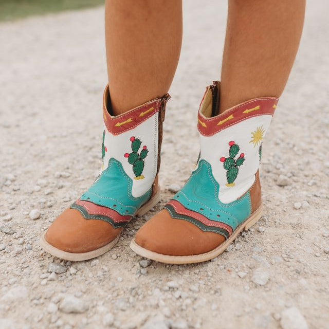 Outfit need a pop of color? Our “Pecos” toddler boot offers bright neon colors with beautiful, embroidered cacti. The color combination of pink, turquoise and green will bring a smile everywhere your little cowgirl goes! Made from real leather, these boots are made to last!