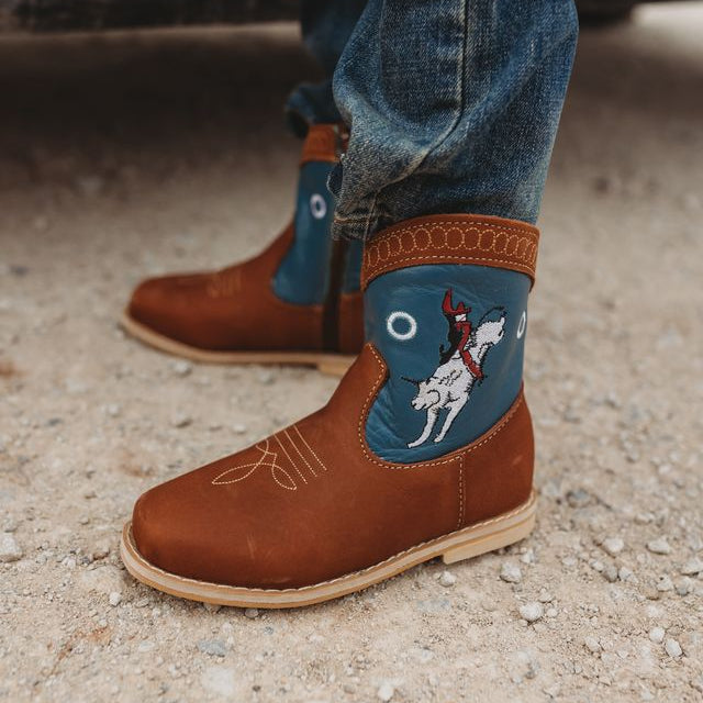 Every cowboy wants to ride a bull! These embroidered bucking bull boots are perfect for any cowboy! The soft brown and blue leather matches any outfit and can be dressed up or down! “Colt” soft leather and hard soles are made last and can outstand any day on the ranch!