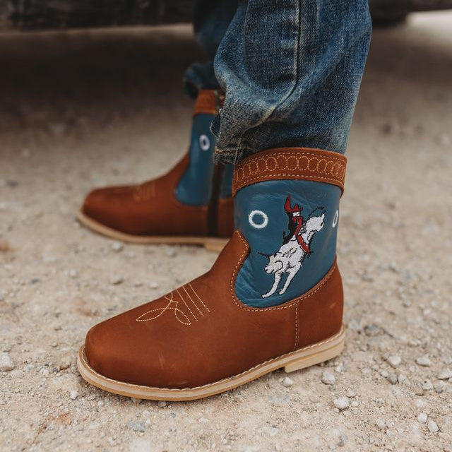 Every cowboy wants to ride a bull! These embroidered bucking bull boots are perfect for any cowboy! The soft brown and blue leather matches any outfit and can be dressed up or down! “Colt” soft leather and hard soles are made last and can outstand any day on the ranch!