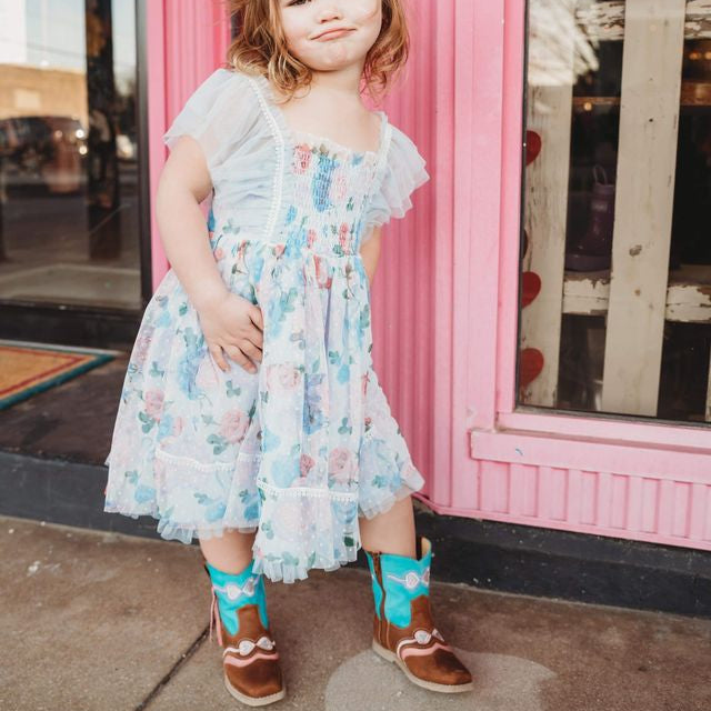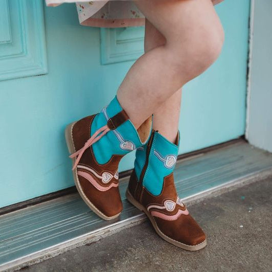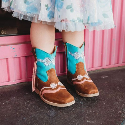 Our beautiful “Hadley” boots are adorned with the perfect pink and turquoise combo that will give any outfit a pop of color! The pink tassels and hearts will make every little girl smile! The turquoise and brown leather is soft and comfortable but made to last!