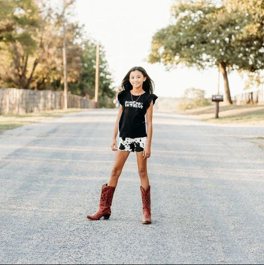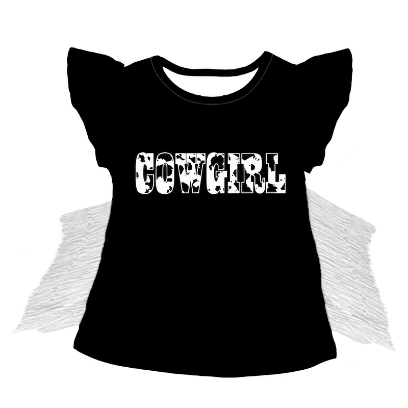 Add a touch of western charm with this black cowprint fringe shirt! Featuring a bold cowprint design and playful fringe details! This shirt is soft, comfortable, & ideal for everyday wear!! Pair with jeans, skirts or shorts, its a must have in your girls wardrobe!